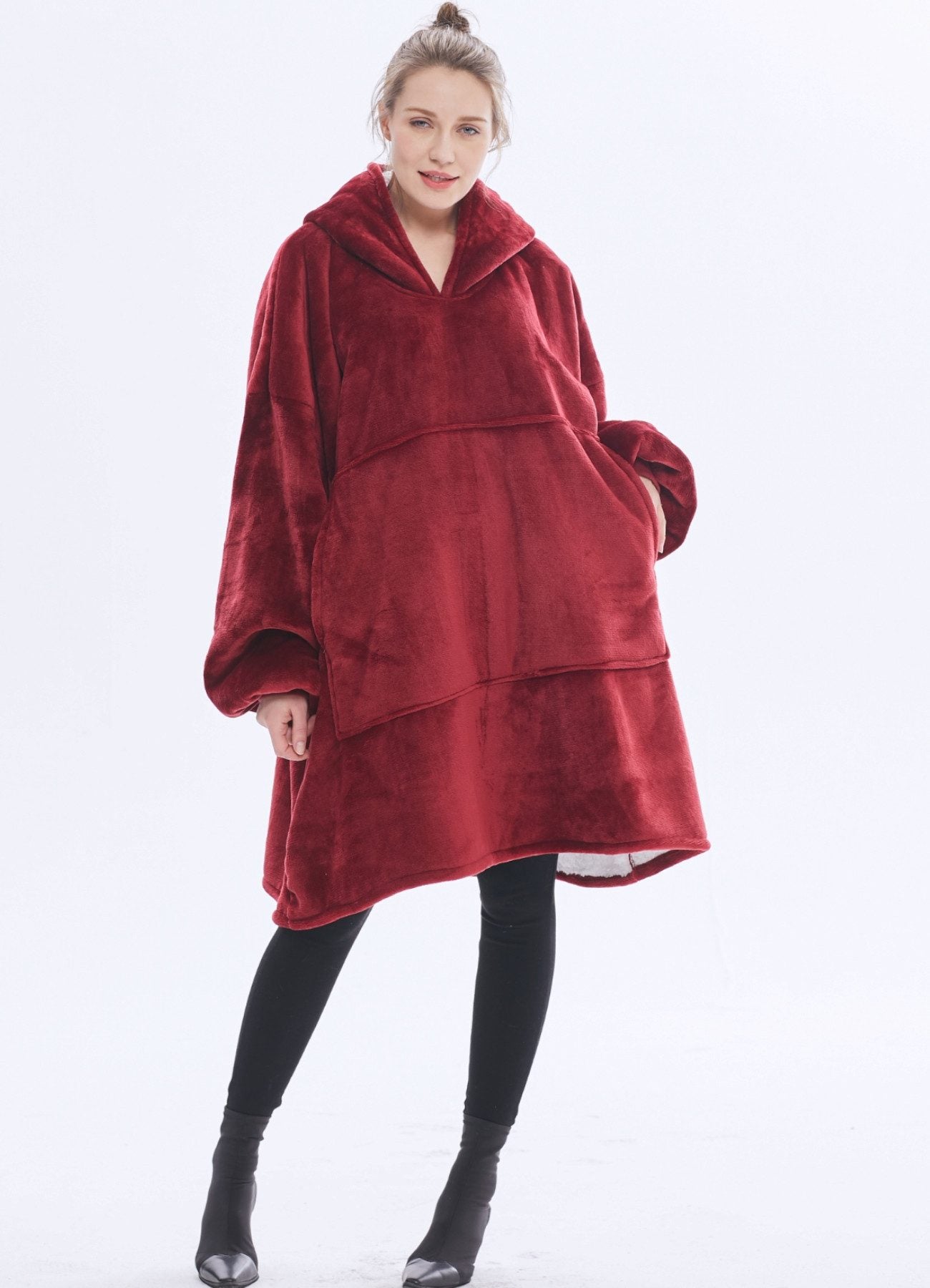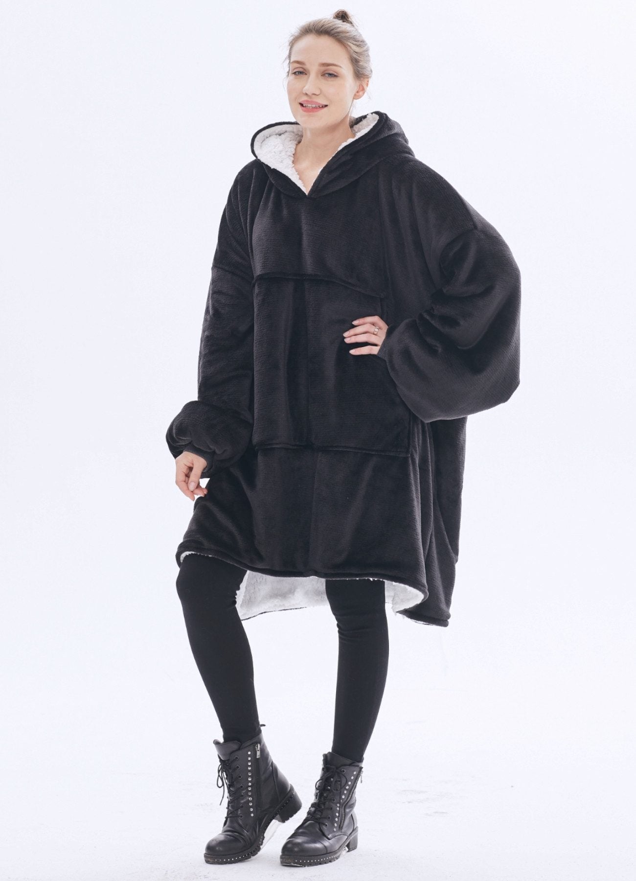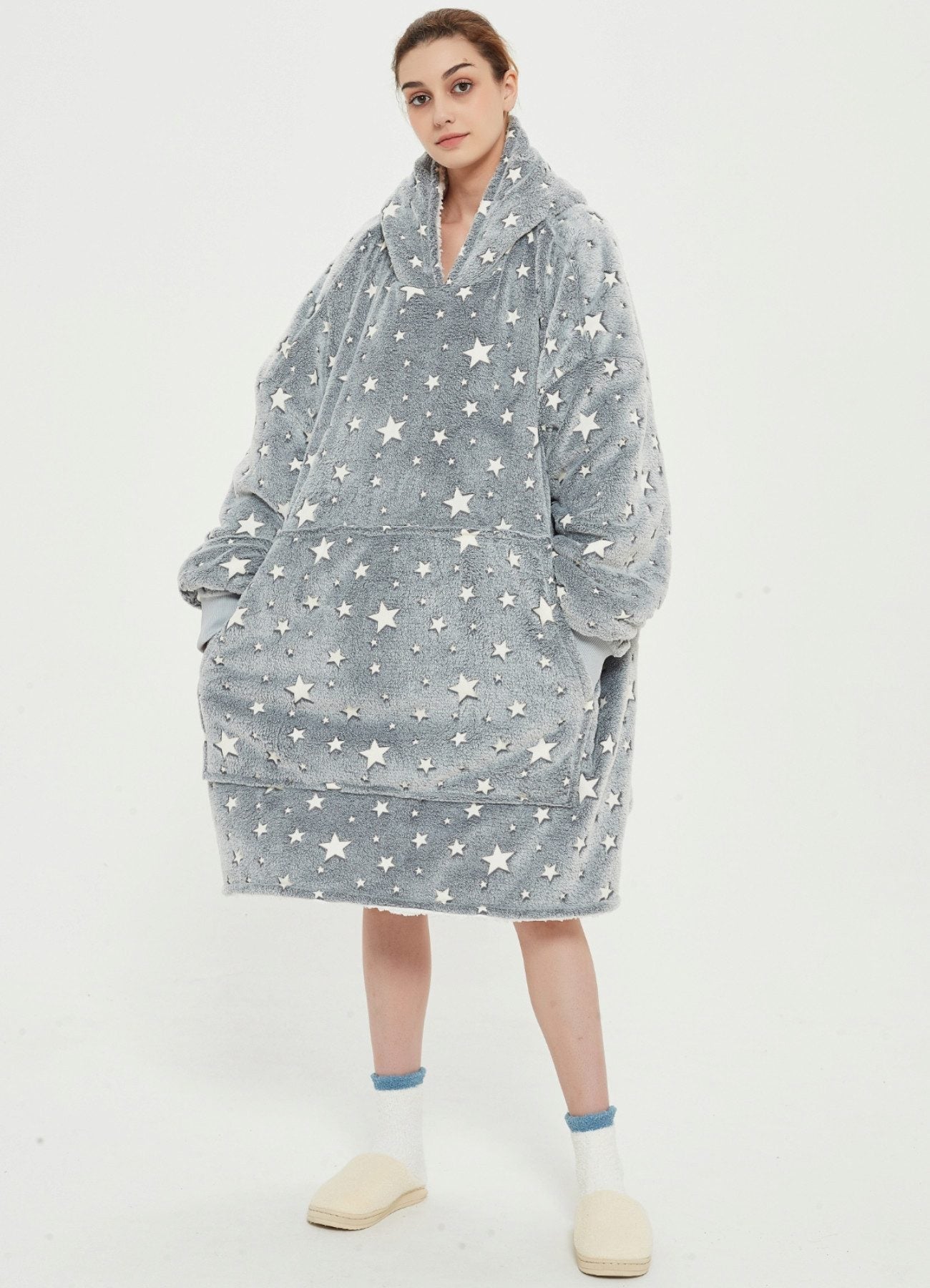 Machen Sie sich bereit für die ultimative Kombination aus Stil, Wärme und Komfort! Unsere Hoodie Kuscheldecke ist perfekt für die kalte Jahreszeit und bietet mit ihrer großzügigen Oversize-Passform maximalen Komfort für Frauen und Männer gleichermaßen (Einheitsgröße passend bis 4XL). Wählen Sie aus fünf eleganten Designs, die in verschiedenen Farben erhältlich sind: Grau (Sterne), Rosa, Weinrot, Schwarz und Marineblau. Die weiche Fleece-Oberfläche mit stilvollen Mustern und die innere Sherpa-Fütterung garantieren kuschelige Wärme an kalten Tagen. Die Kapuze schützt vor Zugluft, während die praktische Bauchtasche Ihre Hände wärmt oder kleine Utensilien verstaut. Elastische Ärmelbündchen sorgen für eine bequeme Passform, die auch beim Entspannen auf der Couch nicht verrutscht. Egal, ob Sie zu Hause sind, auf Reisen entspannen oder ein stilvolles Geschenk suchen – diese Pulloverdecke ist vielseitig einsetzbar und macht jeden Moment gemütlicher. Pflegeleicht und langlebig, bleibt das Material auch nach häufigem Waschen weich und formstabil.