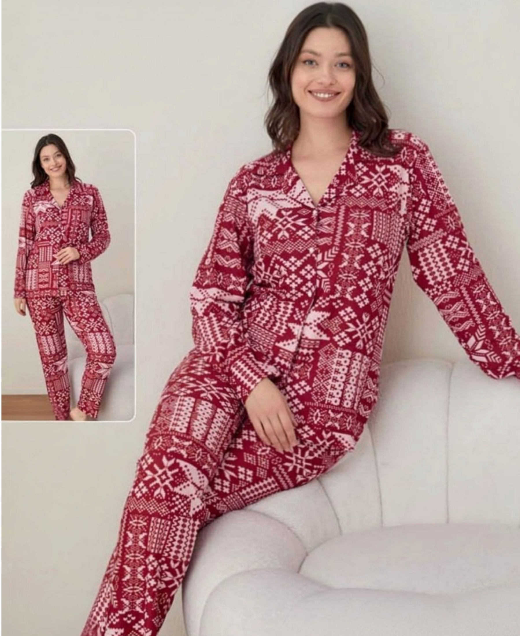 Dieser kuschelige Damen-Pyjama im Norweger-Stil ist der perfekte Begleiter für gemütliche Nächte und entspannte Stunden zu Hause. Die hochwertige Materialmischung aus 70% Polyester & 30% Baumwolle sorgt für eine angenehme Wärme und ein weiches Tragegefühl.