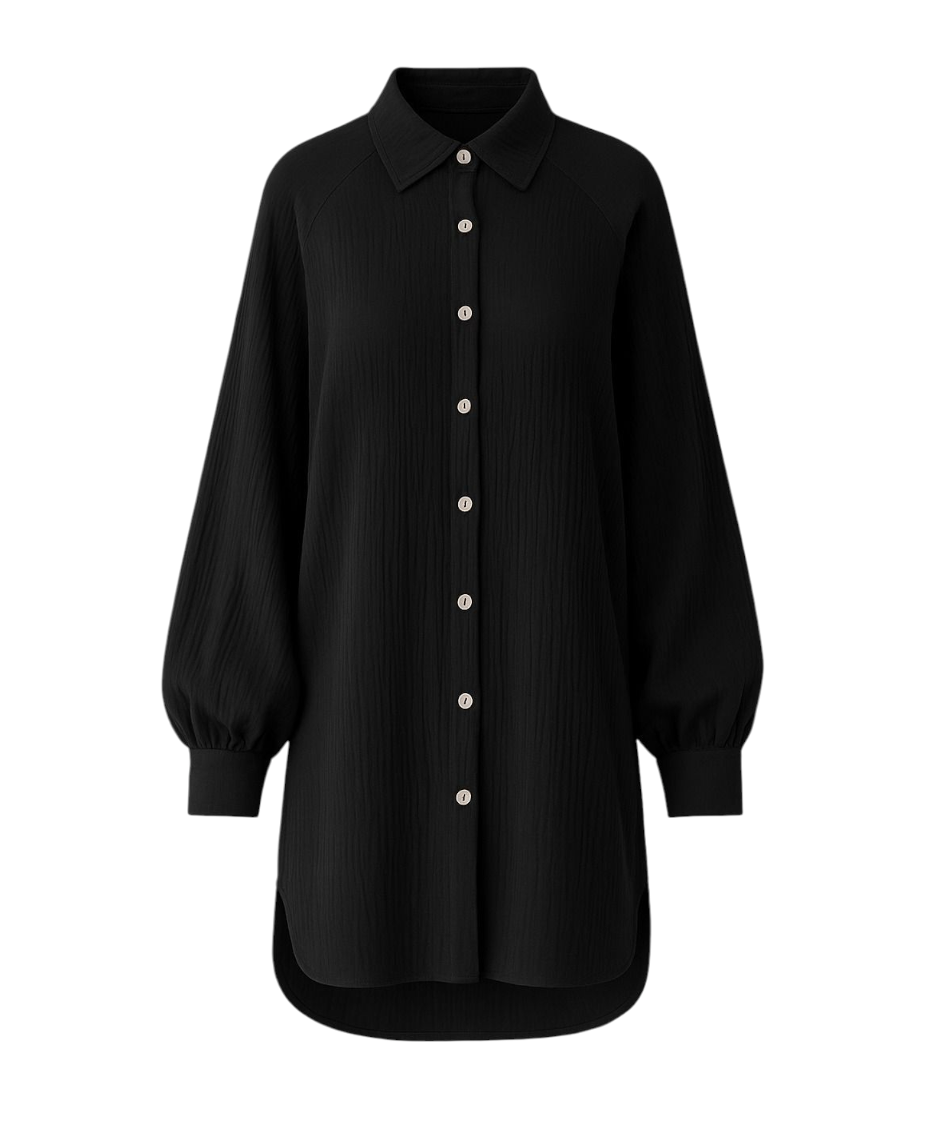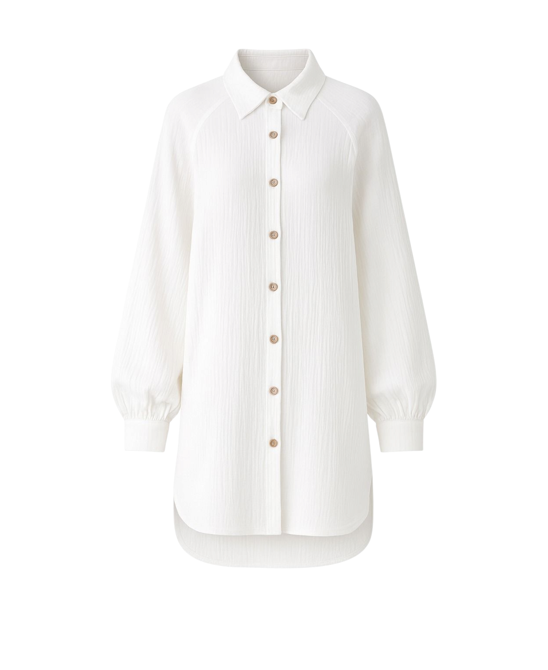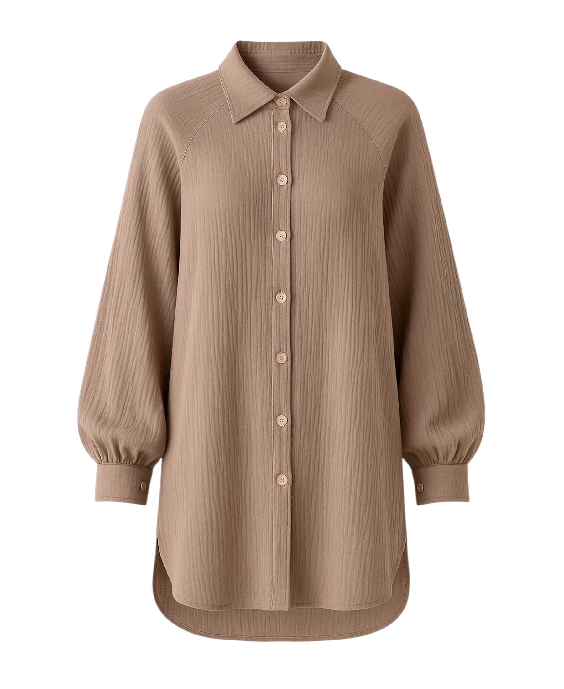 Diese weiche Bluse aus 100 % Baumwolle im Musselin-Stoff wurde nachhaltig hergestellt und kombiniert klassische Hemddetails mit sommerlich-leichtem Tragegefühl. Der gerade Schnitt mit Rückenfalte, die Raglanärmel und die Knopfleiste mit echten Kokosknöpfen machen sie zu einem vielseitigen Kleidungsstück – tragbar als Longbluse, Hemd oder Tunika. Mit einer Länge von 85 cm ist sie perfekt für den Sommer, für Tesettür-Outfits oder entspannte Everyday-Looks geeignet. Ideal kombinierbar mit Musselin-Hosen, Jeans oder über Strandmode. In mehreren Farben und Größen erhältlich.