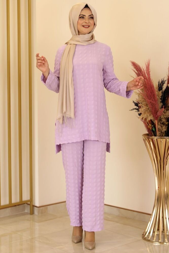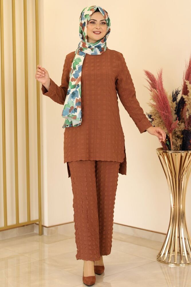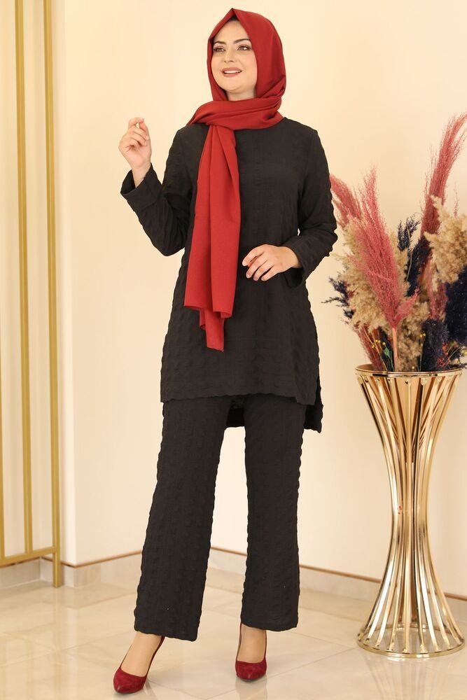 Entdecken Sie unseren eleganten Damen Hosenanzug mit Tunika – ein stilvolles Kombi-Set, das speziell für Hijab-Trägerinnen und modebewusste Frauen entworfen wurde, die Wert auf Komfort und bedeckende Kleidung legen. Dieses Zweiteiler-Set besteht aus einer fließenden Longtunika und einer passenden leichten Sommerhose, beide gefertigt aus dem innovativen Aerobin-Stoff. Der weite und lässige Schnitt des Anzugs sorgt für uneingeschränkte Bewegungsfreiheit und eine schmeichelhafte Passform für jede Figur. Fühlen Sie sich frei und selbstbewusst in jeder Situation. Ob für den Alltag oder besondere Anlässe – dieses Kombi-Set vereint modische Eleganz mit praktischer Funktionalität. Lassen Sie sich von der Qualität und dem Design unseres Damen Hosenanzugs überzeugen und genießen Sie die perfekte Mischung aus Stil und Komfort. Größenvielfalt: Wir glauben, dass jede Frau ihren perfekten Sommeranzug finden sollte. Deshalb bieten wir unser Set in den Größen 38 bis 52 an, um eine breite Palette an Konfektionsgrößen abzudecken. Luftig-leichtes Material: Unser Set ist aus weichem Aerobin-Stoff hergestellt, der sich durch seine außergewöhnliche Weichheit und Luftdurchlässigkeit auszeichnet. Erleben Sie optimalen Tragekomfort und Atmungsaktivität selbst an den wärmsten Tagen. Stilvolle Bedeckung: Die lange Tunika bietet vollständige Bedeckung und ist blickdicht, was sie zur idealen Wahl für Hijab-Trägerinnen macht. Genießen Sie einen dezenten Look ohne Kompromisse bei Stil oder Komfort. Vielseitige Farbauswahl: Unser Hosenanzug ist in einer Palette von Farben erhältlich, von klassischen Tönen bis hin zu lebhaften Sommerfarben. Wählen Sie Ihren Favoriten, um Ihren individuellen Stil zu unterstreichen.