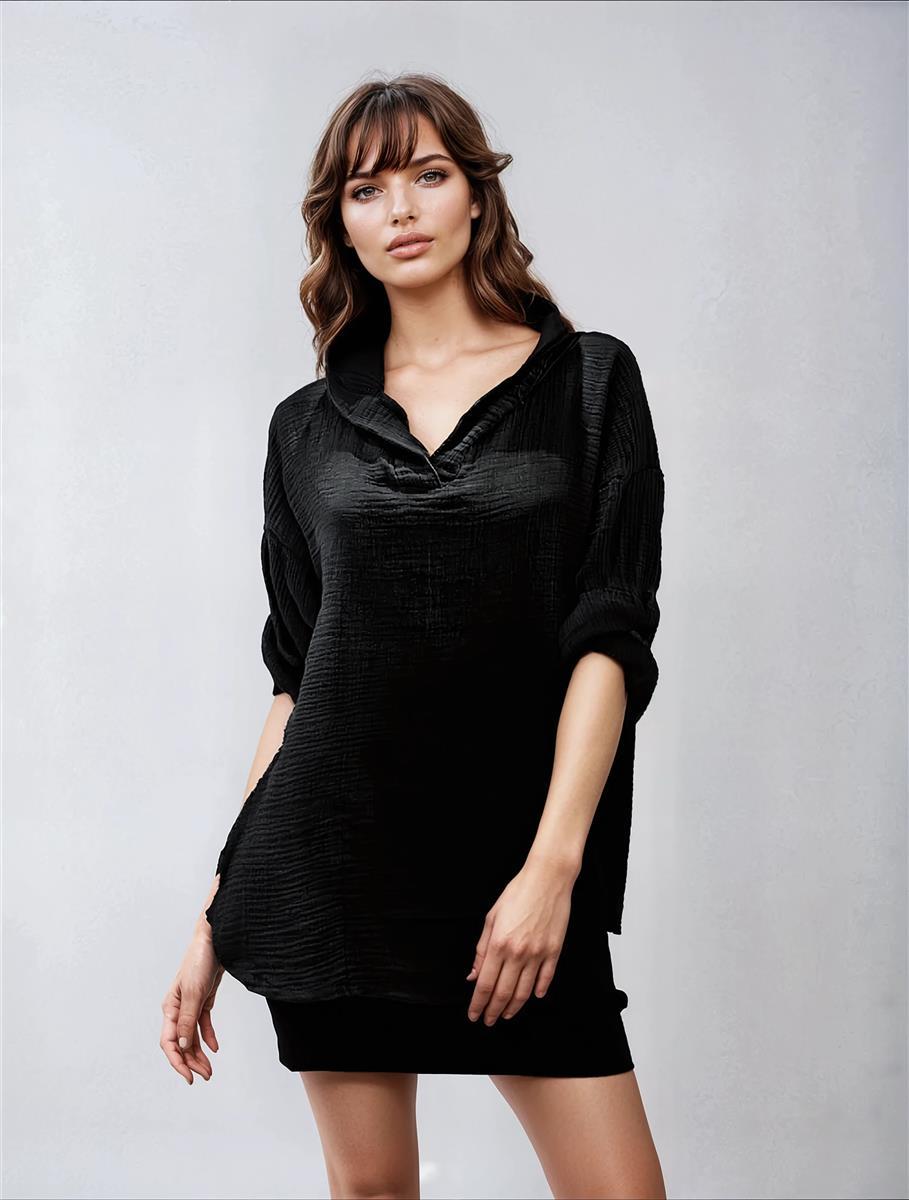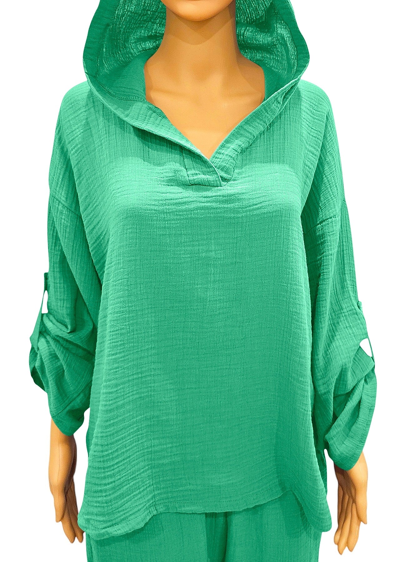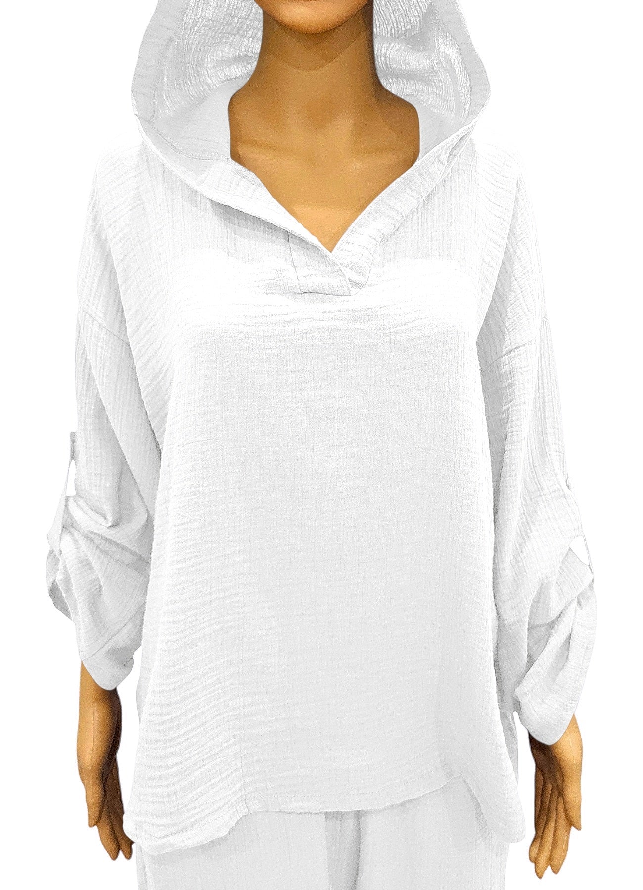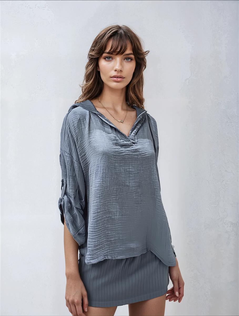 Erleben Sie den Sommer in stilvollem Komfort mit unserem lässigen Musselin Kapuzen-Shirt für Damen. Dieses Oberteil aus 100% atmungsaktiver Baumwolle vereint Leichtigkeit und Eleganz in einem. Der hochwertige Musselin-Stoff sorgt für ein angenehm weiches Tragegefühl und ist gleichzeitig atmungsaktiv, was ihn ideal für warme Tage macht. Die lockere Passform bietet Bewegungsfreiheit und sorgt dafür, dass Sie sich rundum wohlfühlen, egal ob am Strand, beim Stadtbummel oder zu Hause. Die integrierte Kapuze verleiht dem Shirt eine moderne, legere Note und schützt vor leichtem Wind und Sonne. Der V-Ausschnitt und die krempelbaren Langärmel mit Knopfdetails machen das Shirt vielseitig und wandelbar, sodass es sowohl casual als auch etwas schicker kombiniert werden kann. Ein besonderes Highlight sind die strukturierten Details des Musselin-Stoffes, die dem Shirt eine einzigartige Optik und Haptik verleihen. Die Ärmel lassen sich lässig hochkrempeln, ideal für einen entspannten Look. Das Kapuzen-Shirt ist in fünf modischen Farben erhältlich: Beige, Schwarz, Anthrazit, Weiß und Grün. Durch die großzügige Größenauswahl – Größe 1 deckt XS bis M ab und Größe 2 passt für L bis XXL – findet jede Frau die perfekte Passform. Das Shirt ist ein unkompliziertes Schlupfmodell ohne Verschluss, das einfach übergezogen werden kann, und ist somit ein echter Allrounder für den Alltag. Dieses Oberteil lässt sich nicht nur leicht kombinieren, sondern ist auch besonders pflegeleicht: Es ist maschinenwaschbar bei 30°C und bleibt auch nach häufigem Waschen in Form. Seine lockere Passform und die weiche, atmungsaktive Baumwolle machen es zum idealen Begleiter für jeden Sommertag. Setzen Sie auf Komfort und Stil mit unserem Musselin Kapuzen-Shirt – ein unverzichtbares Basic in jeder Sommergarderobe.