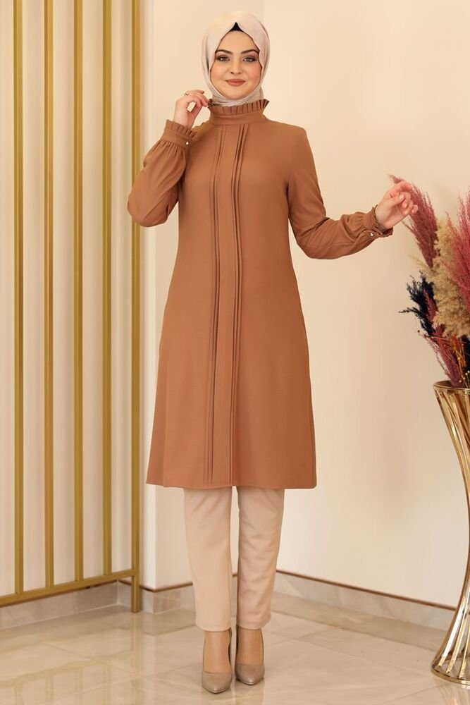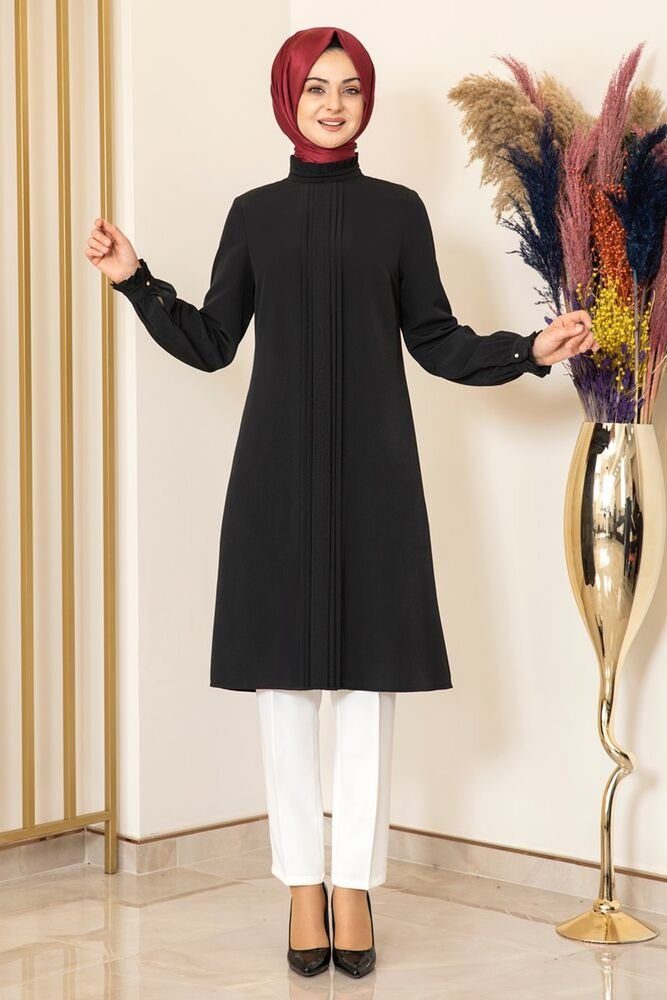 Achtung Größenhinweis: Die Größenangaben 38-48 entsprechen EU-Größen 36-46. Bitte wählen Sie Ihre Größe entsprechend der EU-Größen in Klammern aus, um die perfekte Passform zu gewährleisten. Entdecken Sie unsere elegante und stilvolle Damen Tunika – perfekt für Hijab-Trägerinnen und alle, die Wert auf dezente Mode legen. Diese lange, gerippte Tunika ist in klassischen Farben erhältlich: Schwarz, Navy Blau, Khaki und Ziegelsteinrot. Mit ihrer blickdichten Beschaffenheit bietet sie vollständige Bedeckung und entspricht den Anforderungen einer modesten Garderobe. Die gerippte Struktur verleiht der Tunika eine raffinierte Optik, während der hochgeschlossene Rundhalskragen und die Ärmel mit Knopfverschluss praktische Details darstellen. Gefertigt aus 100% Polyester-Kreppstoff, verspricht diese Long-Tunika ein faltenfreies und schweißfestes Trageerlebnis. Mit einer Länge von 100 cm bietet sie eine optimale Bedeckung. Unser Modell ist 175 cm groß und trägt Größe 38 (EU-36), was Ihnen als Orientierungshilfe dienen kann. Diese vielseitige Tunika ist ein Must-have für jede Garderobe und lässt sich sowohl im Alltag als auch zu besonderen Anlässen tragen.
