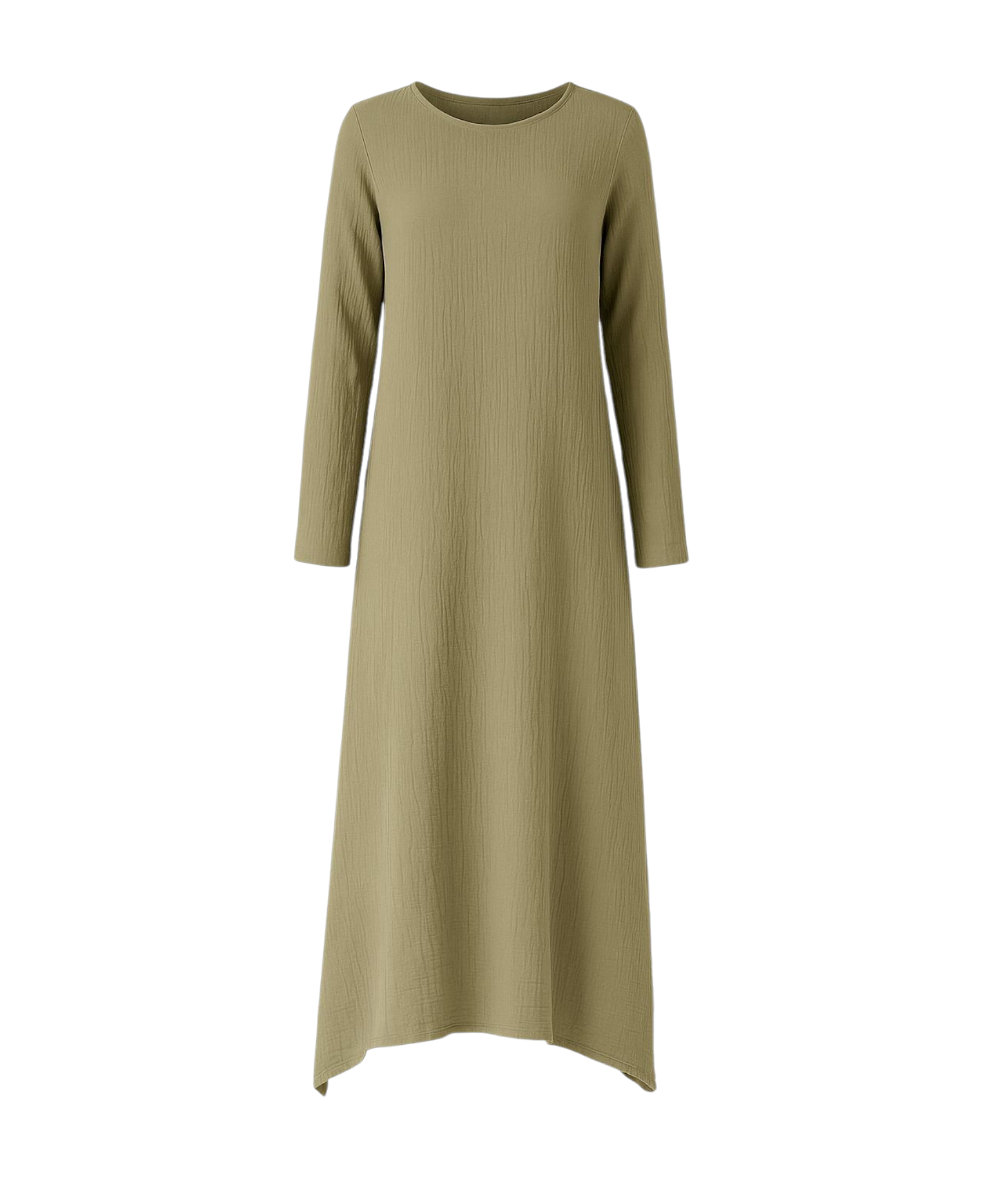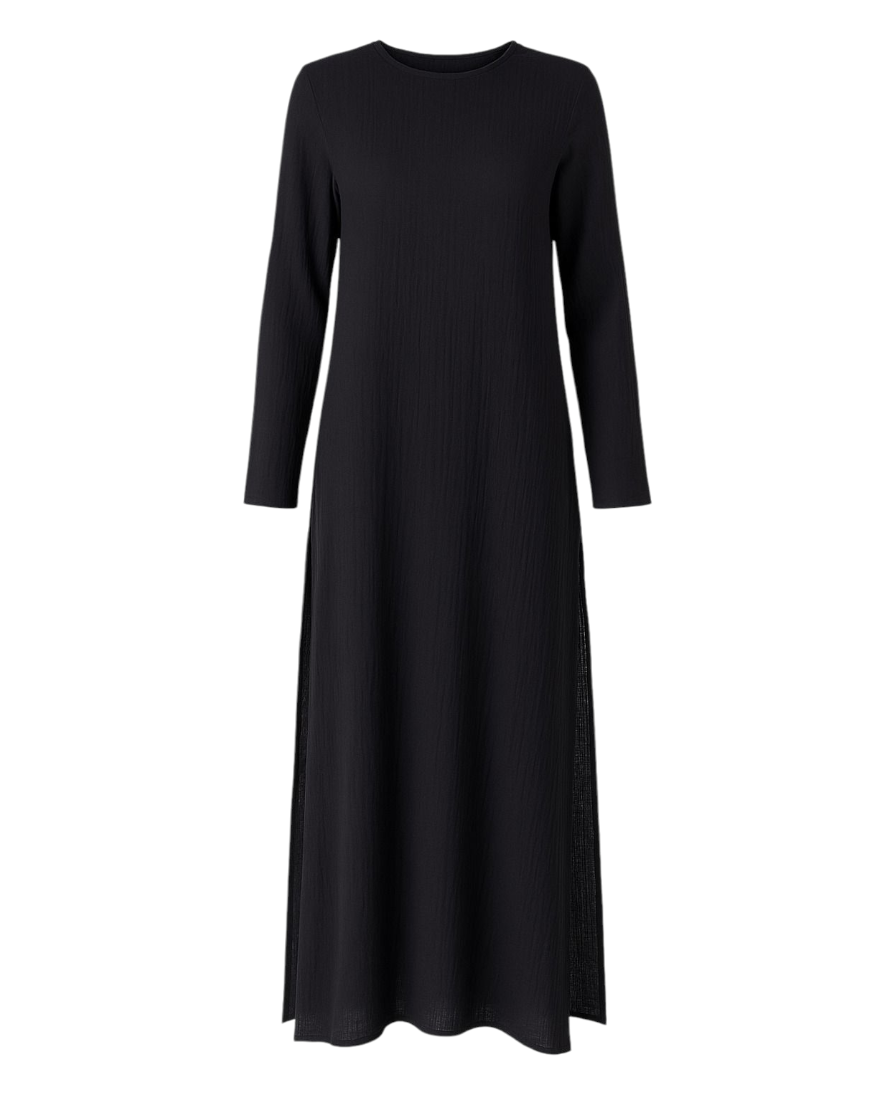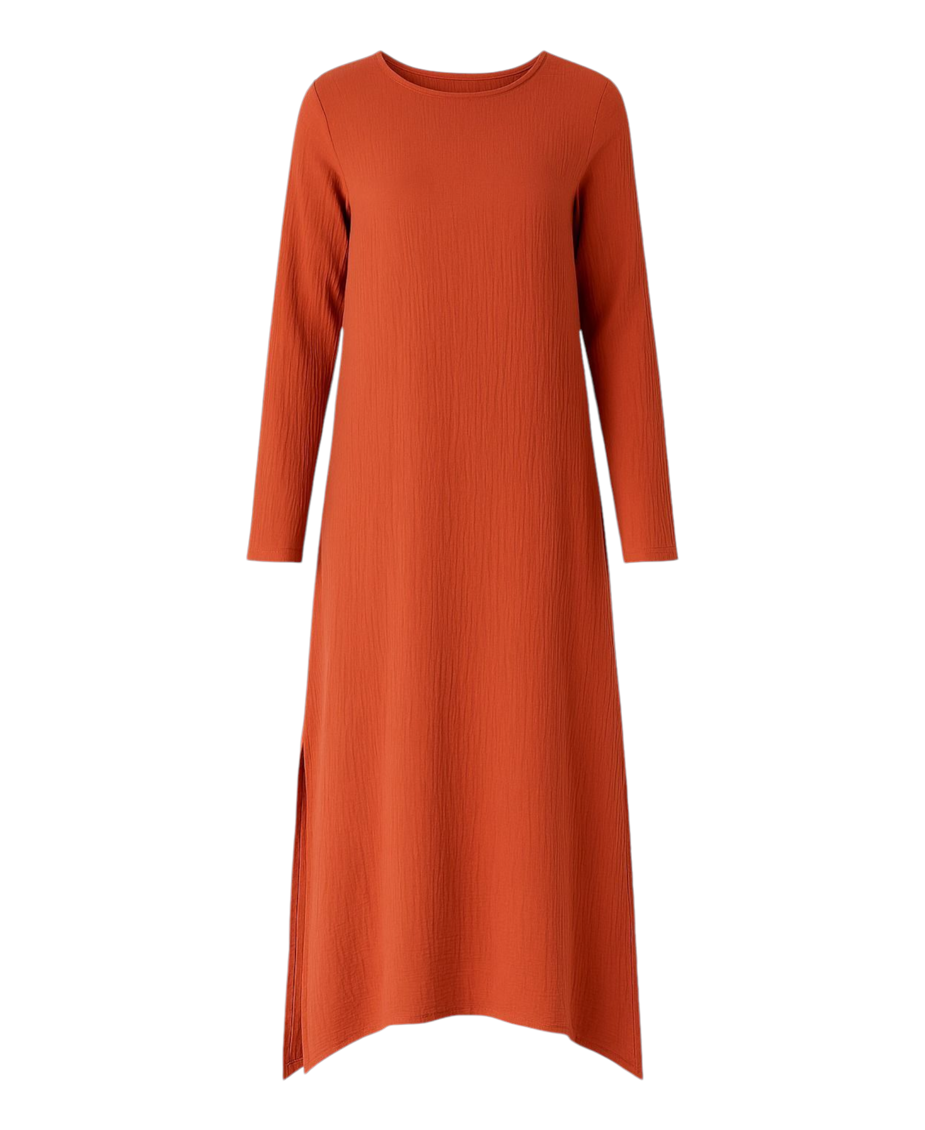 Diese Longtunika aus 100 % Baumwolle mit seitlichen Schlitzen ist 125 cm lang und bietet ein angenehm leichtes Tragegefühl. Der natürliche Musselin-Stoff ist atmungsaktiv, nachhaltig und angenehm auf der Haut. Der lässige, gerade Schnitt mit Rundhalsauschnitt und dezenten Schlitzen macht sie zum perfekten Basic für Tesettür-Outfits, Minimal-Looks oder entspannte Alltagsmode. Die Tunika ist in vier Größen (34–50) sowie in den Farben Taupe, Khaki, Schwarz, Ziegelrot und Navy erhältlich – ideal für Sommer und Übergangszeit.