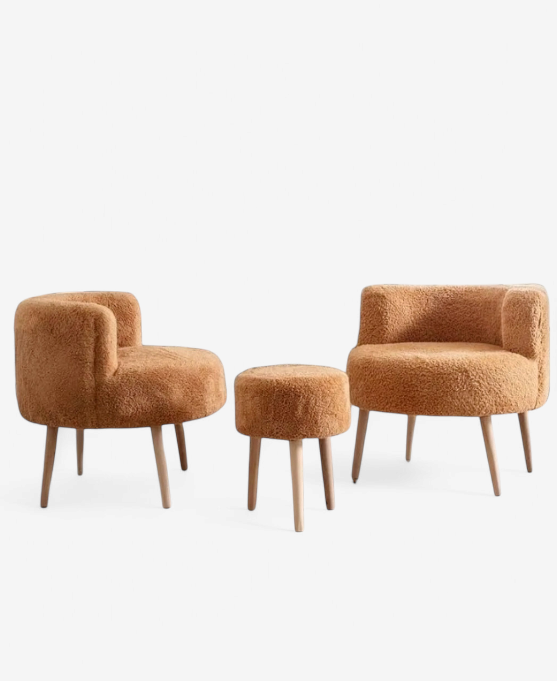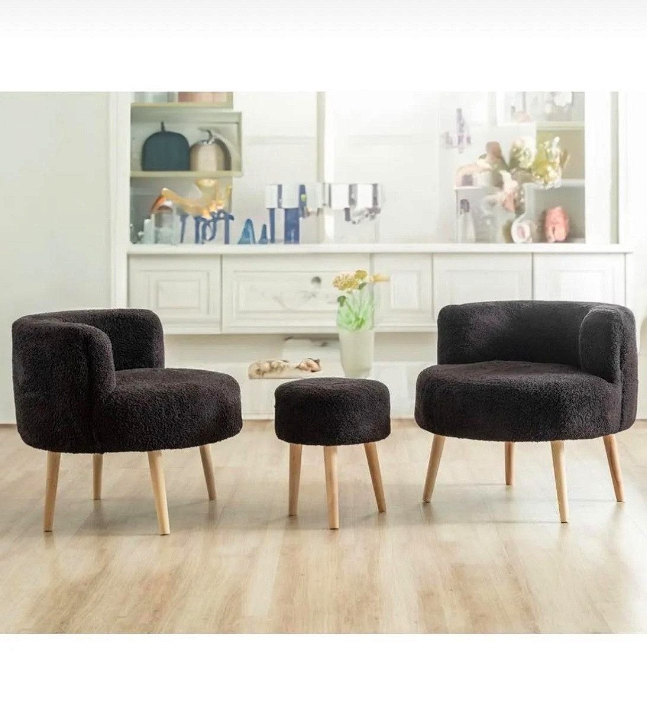Verleihen Sie Ihrem Wohnbereich mit diesem eleganten 3-teiligen Lounge-Set einen Hauch von Stil und Komfort. Das Set besteht aus zwei bequemen Sesseln und einem vielseitig nutzbaren Hocker. Die Sessel sind mit weichem, plüschigem Stoff bezogen und verfügen über stabile Holzbeine, die den modernen skandinavischen Stil perfekt ergänzen. Der Hocker kann als zusätzliche Sitzgelegenheit oder als Fußstütze genutzt werden, was das Set besonders praktisch macht. Wählen Sie aus verschiedenen trendigen Farben wie Cremeweiß, Schwarz, Orange und Gelb, um das Set perfekt an Ihre Einrichtung anzupassen. Die Polsterung bietet ein angenehmes Sitzgefühl, während die Holzbeine Stabilität und Langlebigkeit garantieren. Ideal für Wohnzimmer, Schlafzimmer oder gemütliche Leseecken, ist dieses Set nicht nur ein Highlight in jeder Umgebung, sondern auch ein Must-have für alle, die Komfort und Stil kombinieren möchten. Die Montage ist kinderleicht: Das Set wird fertig geliefert, lediglich die Holzbeine müssen eigenständig montiert werden. Dank der beiliegenden Anleitung ist dies schnell und problemlos erledigt. Die ergonomische Form der Sessel sorgt für optimalen Sitzkomfort, während die hohe Rückenlehne zusätzlichen Halt bietet. Mit seinen pflegeleichten Materialien ist das Lounge-Set besonders alltagstauglich. Einfach mit einem feuchten Tuch abwischen, um Schmutz und Staub zu entfernen. Das robuste Design sorgt dafür, dass die Möbel auch nach längerem Gebrauch in bestem Zustand bleiben. Genießen Sie entspannte Stunden alleine oder gesellige Abende mit Freunden – dieses Lounge-Set macht es möglich.