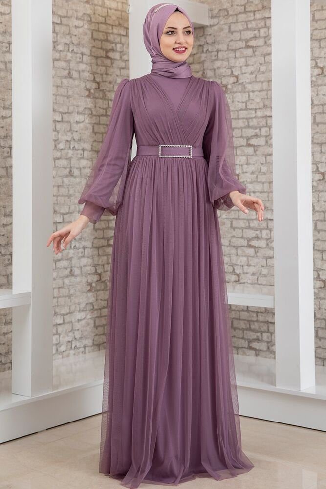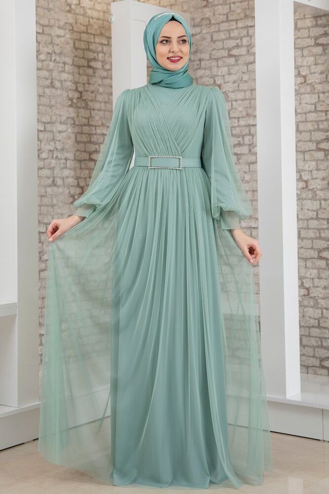 Wichtiger Hinweis: Bitte bestellen Sie unbedingt anhand der EU-Größen in Klammern, da unsere Kleider eine Nummer kleiner ausfallen. Unser langärmliges Damen Maxikleid in verschiedenen Farben ist die perfekte Wahl für jeden besonderen Anlass. Hergestellt aus zartem Tüll und mit einem innenliegenden Futter versehen, bietet dieses Kleid maximale Blickdichte und Komfort. Dieses elegante Kleid bietet eine vollständige Abdeckung ohne Ausschnitt, was es auch ideal als muslimisches Hijab-Kleid macht. Mit einer Kleiderlänge von 160 cm sorgt es für eine majestätische Erscheinung. Erleben Sie zeitlose Eleganz und bestellen Sie noch heute Ihr perfektes Abendkleid für unvergessliche Momente. Das Kleid wird geliefert mit dem abgebildeten Gürtel mit Schmucksteinen. Hinweis: Der Hijab (Kopftuch) auf der Abbildung ist nicht inklusive. Das Modell auf den Bildern ist 176 cm groß und trägt die Größe 38.