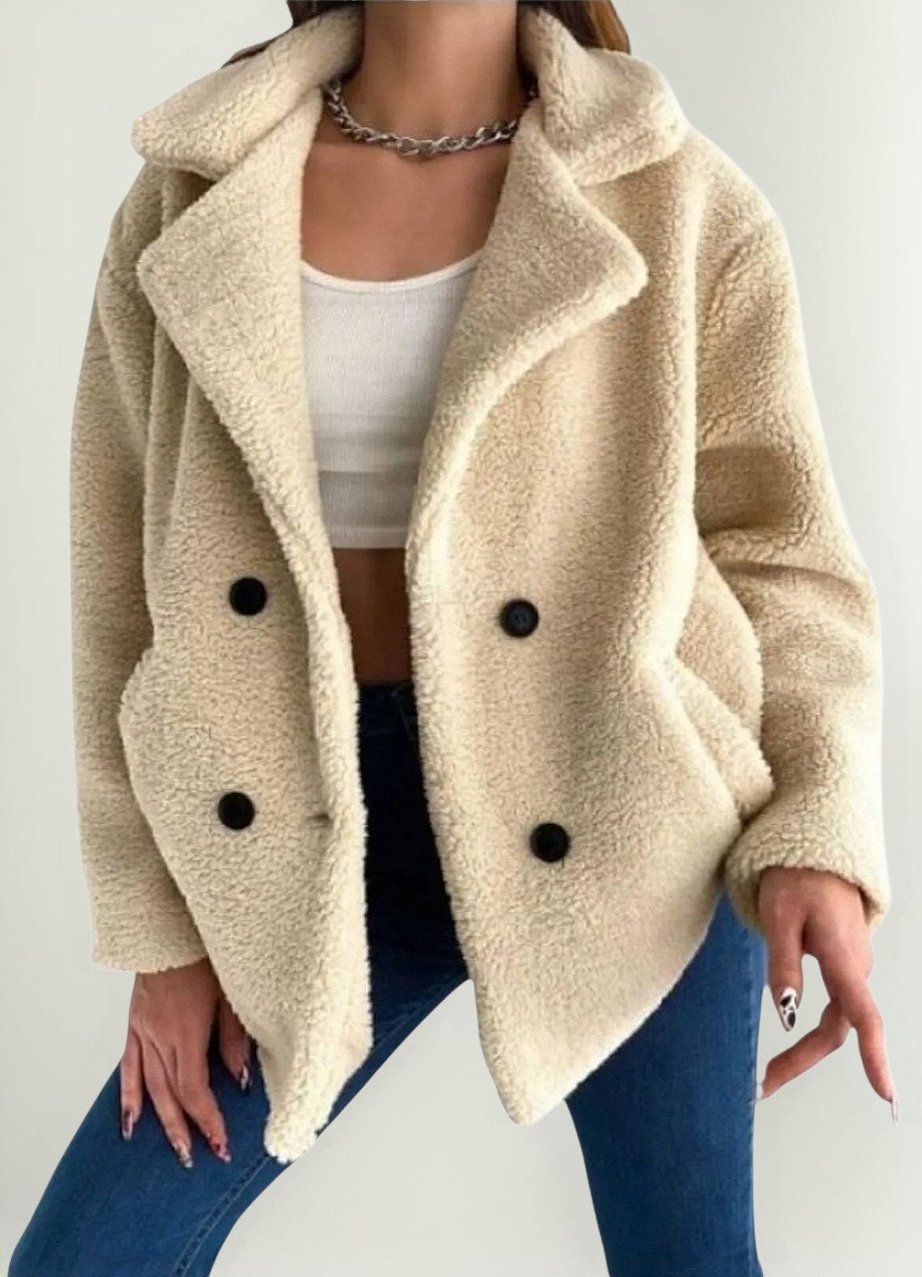 Diese stilvolle Oversize Plüschjacke für Damen vereint modernen Look mit ultimativem Komfort. Hergestellt aus weichem, wärmendem Plüschstoff, ist diese Jacke der perfekte Begleiter für kalte Herbst- und Wintertage. Die Jacke verfügt über ein doppelreihiges Knopfdesign und praktische Taschen, die sowohl stylisch als auch funktional sind. Der weiche Kragen verleiht der Jacke einen eleganten Touch und schützt gleichzeitig vor Wind und Kälte. Durch den lockeren Oversize-Schnitt ist die Jacke perfekt, um sie über verschiedenen Outfits zu tragen – ob leger mit Jeans und Sneakers oder schick mit einem Kleid. Verfügbar in den klassischen Farben Schwarz und Beige, lässt sich die Jacke vielseitig kombinieren. Das hochwertige Material ist nicht nur besonders weich, sondern auch langlebig und pflegeleicht. Ein Must-have für jede Garderobe, das Funktionalität und Stil perfekt miteinander verbindet. Pflegehinweis: Die Jacke ist maschinenwaschbar bei 30 °C, sollte jedoch nicht im Trockner getrocknet werden.