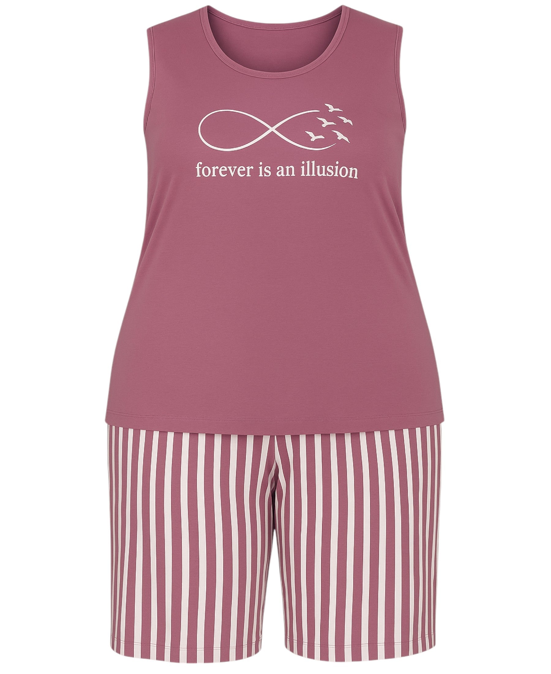 Dieser 2-teilige Hausanzug für Damen in großen Größen kombiniert Bequemlichkeit & Stil – ideal als Schlafanzug, Loungewear oder Sommer-Homewear für entspannte Stunden zu Hause oder beim Schlafen. Das Set besteht aus einem ärmellosen Rundhals-Top mit Print und einer kurzen, locker sitzenden Hose.