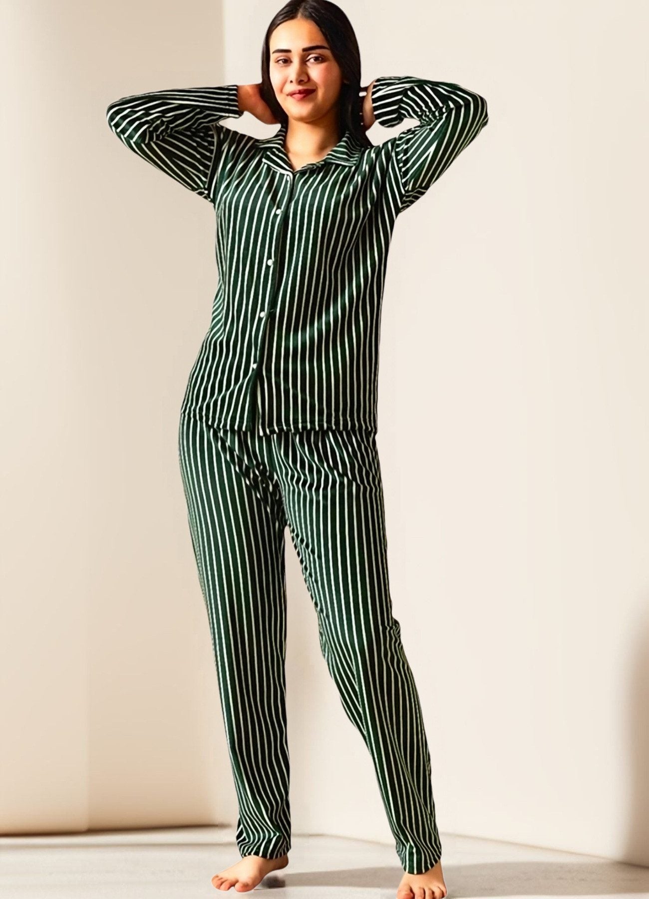 Wichtiger Größenhinweis: Bitte bestellen Sie unbedingt anhand der passenden Konfektionsgrößen in Klammern. Gönnen Sie sich luxuriösen Komfort mit unserem zweiteiligen Damen Pyjama Set aus hochwertiger 100% Samt-Baumwolle. Erhältlich in den Größen S bis XL und in den eleganten Farbkombinationen Schwarz-Weiß oder Grün-Weiß gestreift, vereint dieses Set Stil und Gemütlichkeit für entspannte Abende und erholsame Nächte. Das langärmelige Oberteil ist mit einem klassischen Hemdkragen und einer durchgehenden Knopfleiste ausgestattet. Diese Details ermöglichen ein einfaches An- und Ausziehen und verleihen dem Set einen Hauch von Eleganz. Der weiche Samtstoff bietet ein samtiges Hautgefühl und hält Sie an kühleren Nächten angenehm warm. Die sorgfältige Verarbeitung und der komfortable Schnitt sorgen für eine optimale Passform und höchsten Tragekomfort. Die dazu passende Hose verfügt über einen elastischen Bund ohne störende Verschlüsse, der sich sanft an Ihre Taille anpasst und maximale Bewegungsfreiheit garantiert. Die lockere Passform der Hose ermöglicht uneingeschränkten Komfort, egal ob Sie schlafen oder einfach nur entspannen. Die stilvollen Streifenmuster in Schwarz-Weiß oder Grün-Weiß verleihen dem Pyjama einen zeitlosen und modischen Look. Die pflegeleichte Samt-Baumwolle ist nicht nur weich und warm, sondern auch langlebig. Das Material ist atmungsaktiv und hautfreundlich, sodass Sie sich rundum wohlfühlen können. Das Pyjama-Set ist maschinenwaschbar bei 30°C und behält auch nach mehreren Wäschen seine Form und Weichheit – kein Bügeln erforderlich. Machen Sie sich selbst oder Ihren Liebsten eine Freude mit diesem stilvollen Pyjama-Set, das Eleganz und Gemütlichkeit in perfekter Harmonie vereint. Ob als Nachtwäsche, Loungewear oder gemütlicher Hausanzug – dieses Set ist die ideale Wahl für Frauen, die Wert auf Qualität und Stil legen.