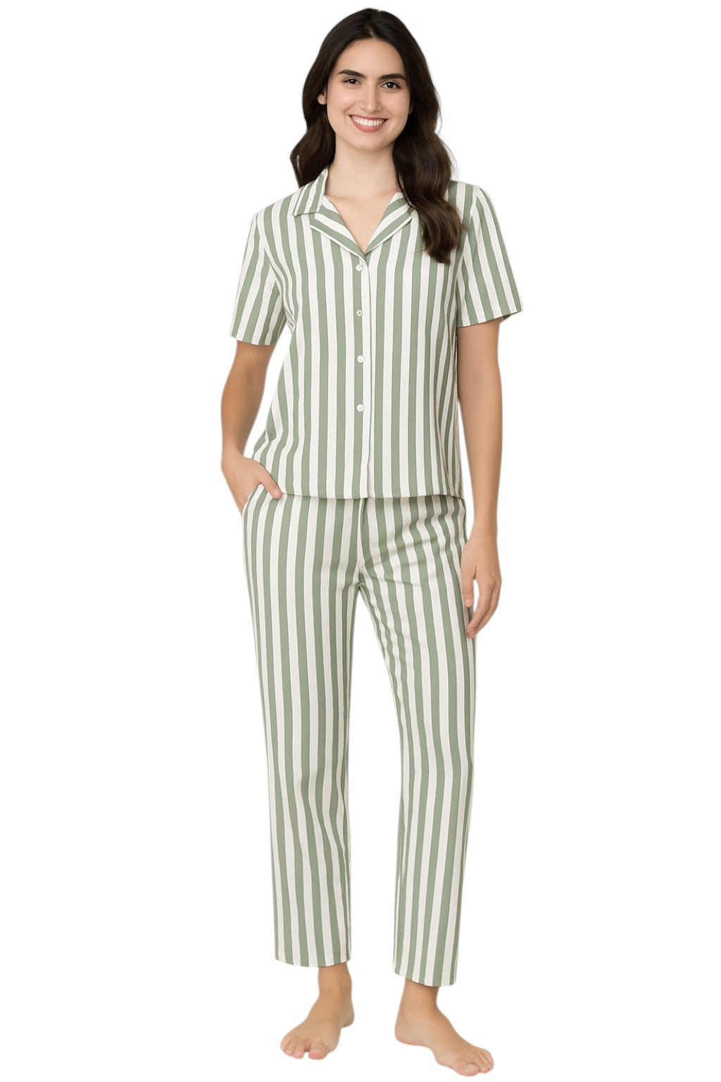 Das klassische Streifenmuster in Grün-Weiß wirkt zugleich frisch, stilvoll & sommerlich leicht – ideal für Frühjahr, Sommer oder als Übergangsset fürs ganze Jahr.